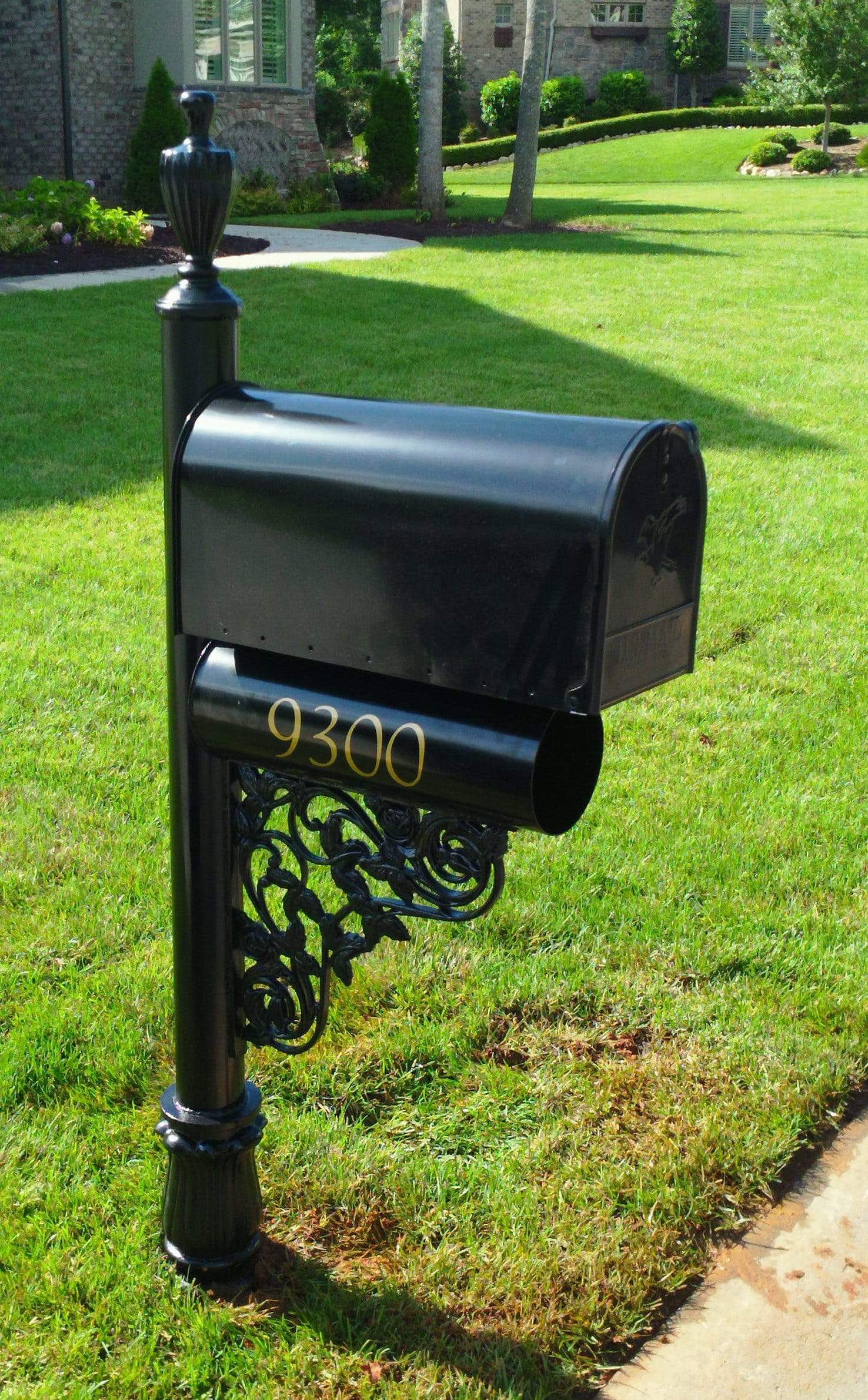 The Hunter Oaks mailpost system features a 3-1/2" round post, urn finial, rose bracket, decorative collar and 6" round newspaper holder. The system comes standard with a large-sized (T2) rural mailbox and 3" gold vinyl numbers on the newspaper holder. Gloss black finish.