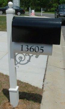 The Old Stone mailpost system features a 3" square post with 4" square base, ivy bracket, ball finial, and 6" round newspaper holder. The Old Stone includes a large (T2) black rural mailbox with 3" black numbers on the newspaper holder. Post comes in a white finish.