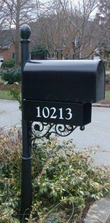 The Park Crossing mailpost system features a 2-3/8" round post, egg finial, fluted base, scroll bracket, a 6" square newspaper holder, and large-sized (T2) rural mailbox with 3" white vinyl numbers on the newspaper holder. Gloss black finish.